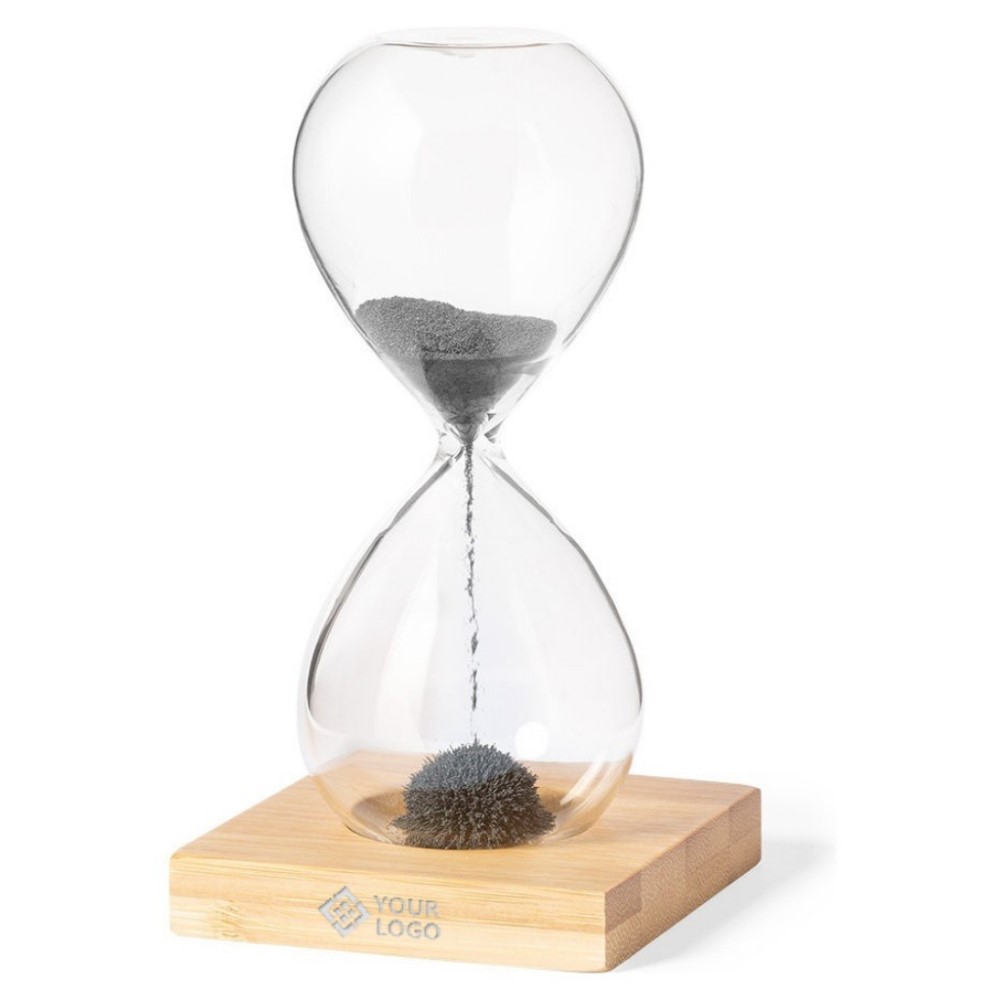 Manyetik Kum Saati Ebat: 7.9 cm x 15.5 cm x 7.9 cm Borosilikat Cam ve Bambu ahşap materyal Siyah ferrit mıknatıs kumu Minimum satış adedi: 50 * Baskı, KDV ve özel tasarım aşağıdaki fiyatlara dahil değildir.